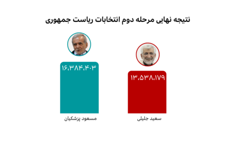 - در دور اول انتخابات، مسعود پزشکیان با کسب ۱۰ میلیون و ۴۱۵ هزار و ۹۹۱ رای و سعید جلیلی با کسب ۹ میلیون و ۴۷۳ هزار و ۲۹۸ رای به دور دوم راه یافتند