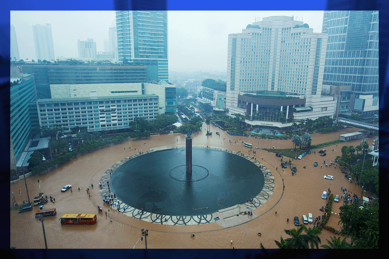 در حال حاضر نیمی از شهر جاکارتا پایینتر از سطح دریا قرار دارد. موقعیت این شهر روی زمینی باتلاقی که در آن ۱۳ رودخانه به اقیانوس میریزند آن را بسیار آسیبپذیر کرده است.