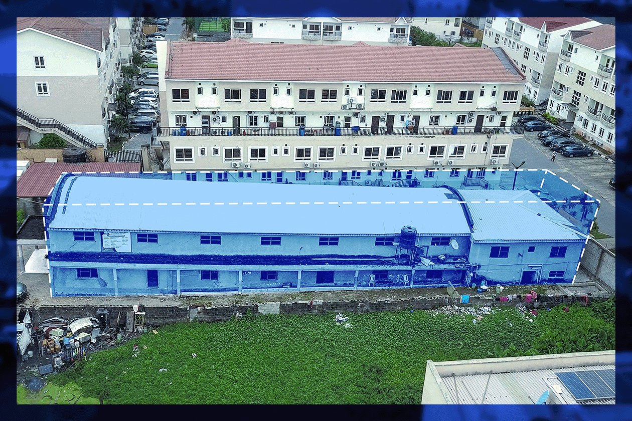 ساختمانهایی در منطقه ابوت متا در شهر لاگوس که روکایات در آن زندگی میکند و در حال فرونشست است. خط نقطهچین سفید موقعیت قبلی ساختمان را نشان میدهد
