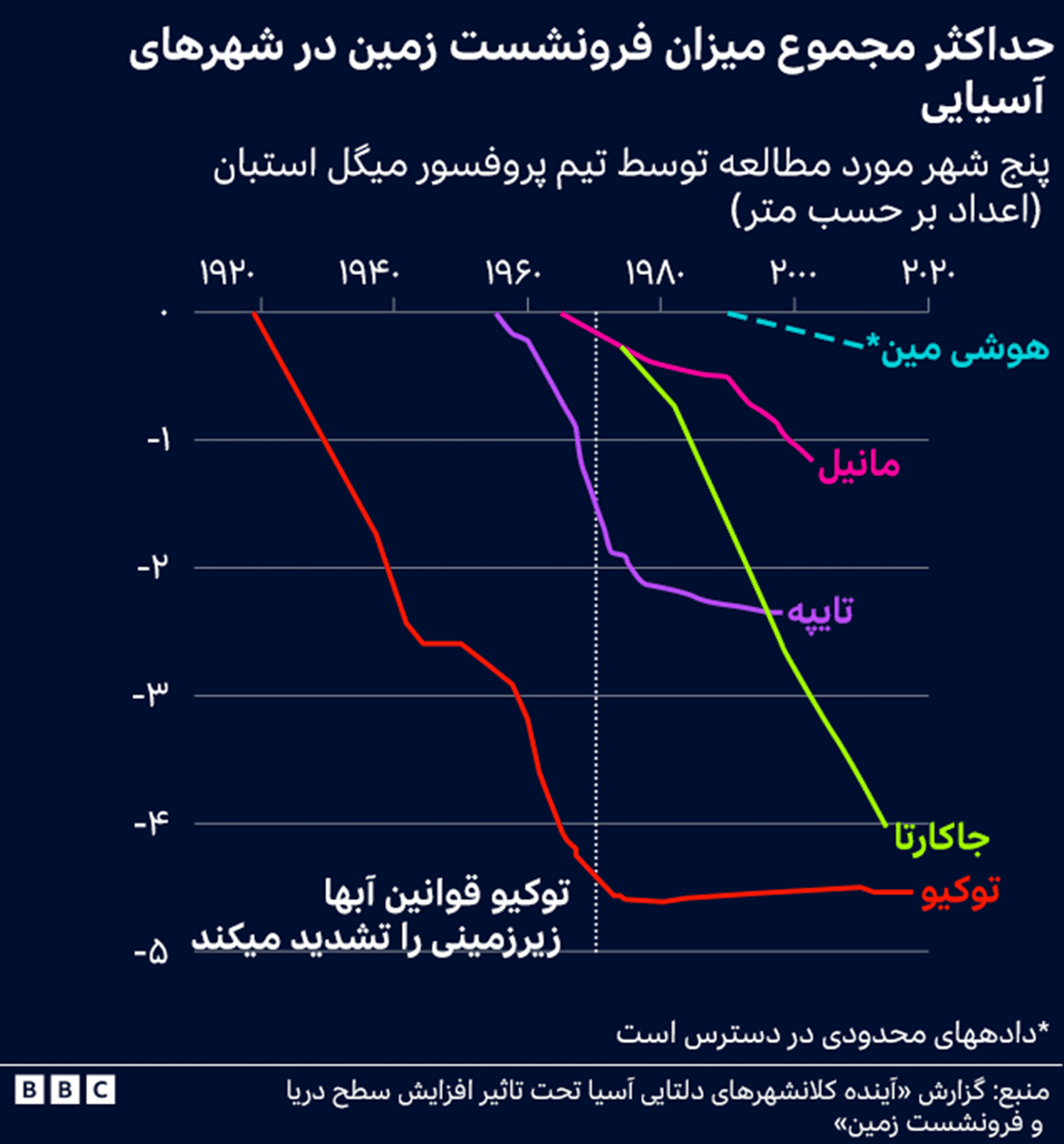 خانم تای میگوید: «بسیاری از شهرهایی که در حال فرونشست هستند در آسیا یا آسیای جنوب شرقی واقع شدهاند. دلیلش احتمالا این است که در این مناطق به دلیل رشد بسیار سریع جمعیت و توسعه گسترده شهری تقاضا برای آب بسیار بالاست».