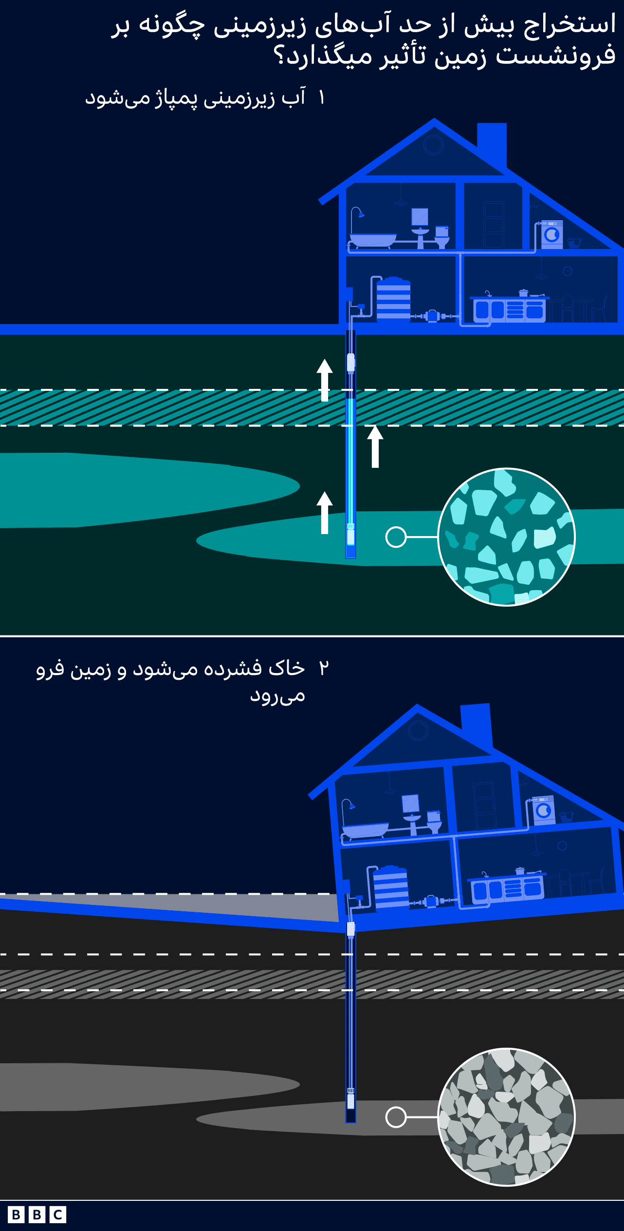 برداشت آب به مقادیر بیش از حد به این شیوه در درازمدت منجر به فشرده شدن خاک میشود و در نهایت باعث میشود که سطح زمین و هر چیزی که روی آن بنا شده فرو برود یا نشست کند.