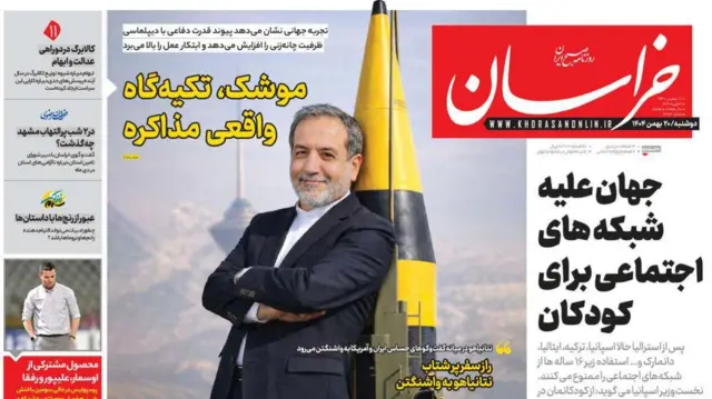 روزنامه خراسان که به طور همزمان در تهران و مشهد منتشر میشود هم در شماره امروز گزارشی تحلیلی از مذاکرات اخیر ایران و آمریکا منتشر کرده است. این روزنامه با انتشار عکسی از عباس عراقچی، وزیر خارجه که در طرح این روزنامه به یک فروند موشک تکیه داده، نوشته است که «تجربه جهانی نشان میدهد که پیوند قدرت دفاعی با دیپلماسی، ظرفیت چانهزنی را افزایش میدهد.»