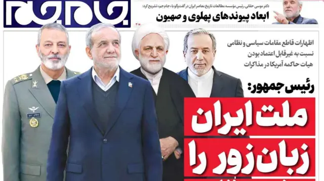 روزنامه جامجم، وابسته به صداوسیمای جمهوری اسلامی، در شماره امروز طرحی از رئیسجمهور، رئیس قوه قضائیه، وزیر خارجه و رئیس ستاد کل نیروهای مسلح جمهوری اسلامی را منتشر کرده و تیتر گزارش خود را از قول مسعود پزشکیان نقل کرده است که «ملت ایران زیر بار زور نمیرود.»