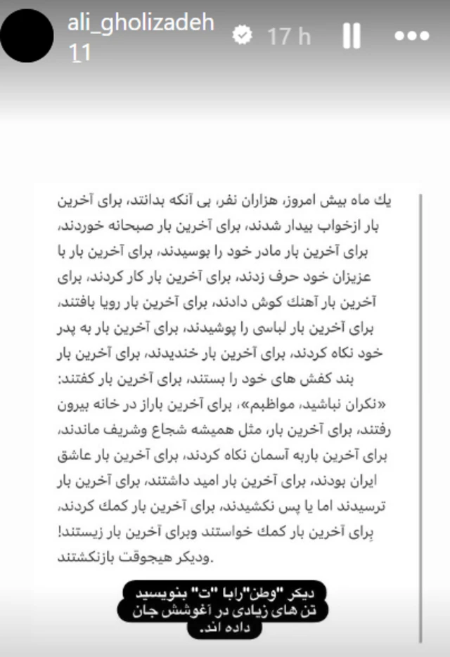 ۶ ساعت پیشجواد قلیزاده، بازیکن تیم ملی فوتبال: دیگر «وطن» را با «ت» بنویسید، تنهای زیادی در آغوشش جان دادهاند